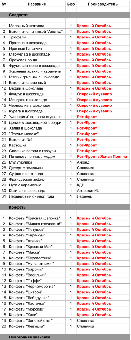 Молочный шоколад (1 шт), Батончик с начинкой "Аленка" (1 шт), Трюфели (1 шт), Пралине в шоколаде (1 шт), Ирисный батончик (1 шт), Мармелад в шоколаде (1 шт), Ореховая роща (1 шт), Фруктовое желе в шоколаде (1 шт), Жареный арахис и карамель (1 шт), Мягкий грильяж в шоколаде (1 шт), Батончик сливочный (1 шт), Вафли в шоколаде (1 шт), Конфеты "Красная шапочка" (1 шт), Конфеты "Мишка косолапый" (1 шт), Конфеты "Петушок" (1 шт), Конфеты "Кара-кум" (1 шт), Конфеты "Аленка" (1 шт), Конфеты "Красный Мак" (1 шт), Конфеты "Маска" (1 шт), Конфеты "Буревестник" (1 шт), Конфеты "Ну-ка отними!" (1 шт), Конфеты "Барокко" (1 шт), Конфеты "Васильки" (1 шт), Конфеты "Тоффи" (1 шт), Конфеты "Черноморочка" (1 шт), Конфеты "Цитрон"(1 шт), Конфеты "Лебедушка" (1 шт), Конфеты "Ласточка" (1 шт), Конфеты "Морские" (1 шт), Конфеты "Киви" (1 шт)
