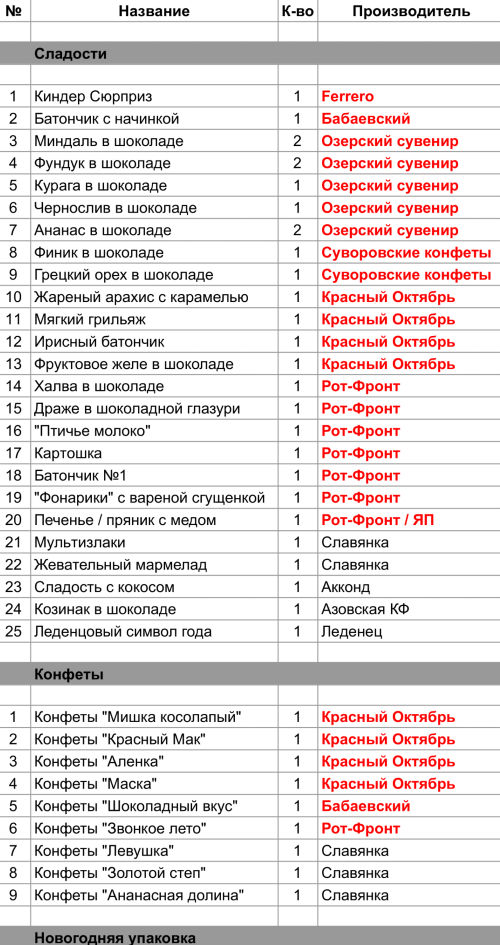 Халва в шоколаде (1 шт), Драже в шоколадной глазури (1 шт), "Птичье молоко" (1 шт), Картошка (1 шт), Батончик №1 (1 шт), "Фонарики" с вареной сгущенкой (1 шт), Печенье / пряник с медом (1 шт), Конфеты "Звонкое лето" (1 шт)